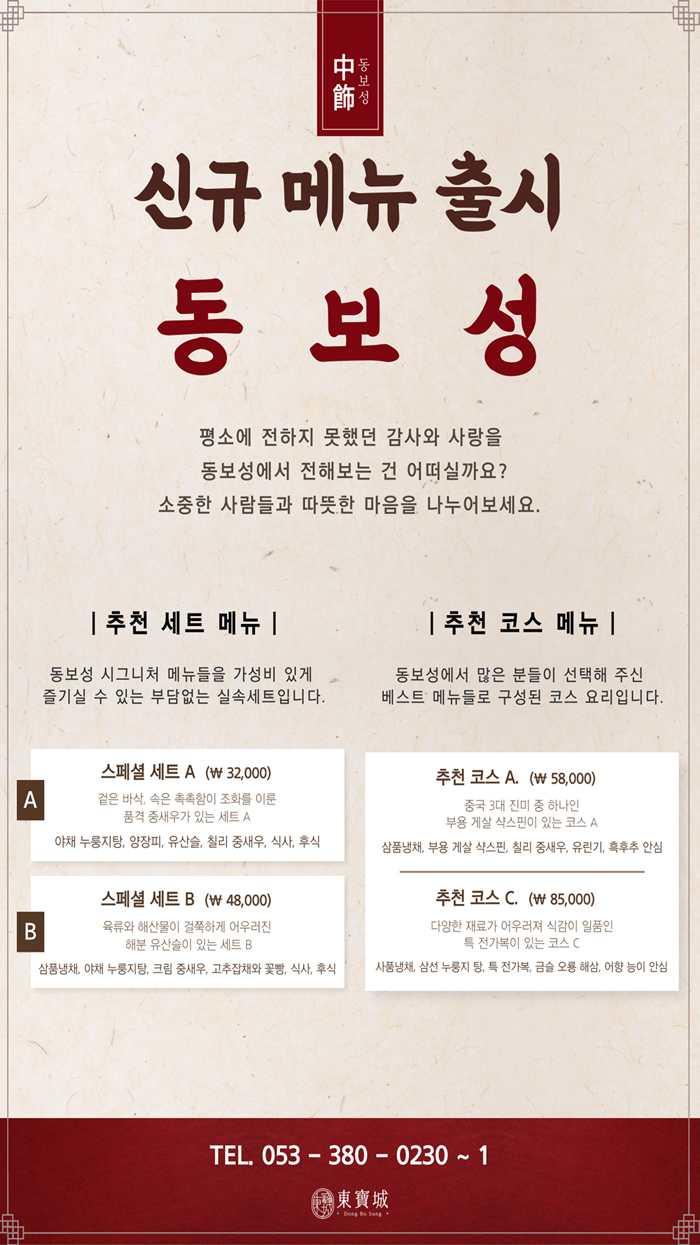 스페셜 세트 B. (₩ 48,000) : 삼품냉채, 야채 누룽지탕, 크림 중새우, 고추잡채와 꽃빵, 식사, 후식